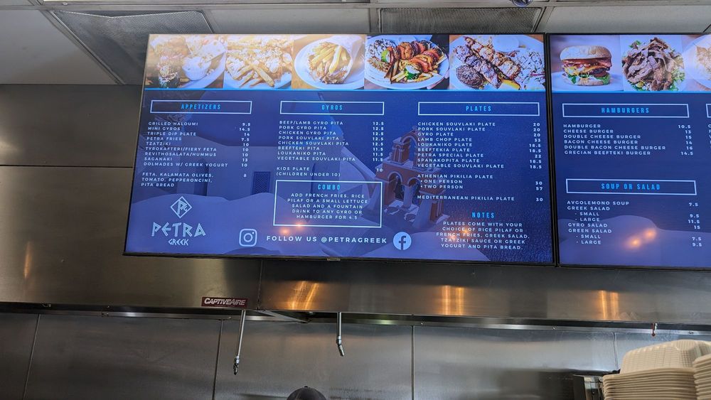 Petra Greek, located in Sacramento, offers a delightful blend of Greek-Mediterranean cuisine with a range of options suitable for various dietary preferences. The restaurant provides a casual setting with vegan and limited vegetarian options, making it a versatile choice for diners. With amenities like delivery, takeout, outdoor seating, and happy hour specials, Petra Greek ensures a pleasant dining experience. Highlights of the menu include the Triple Dip Plate with Tzatziki sauce, Greek hummus, and spicy feta cheese, as well as the Gyro Salad and Beef & Lamb Gyro Pita. The dishes showcase the authentic flavors of Greek cuisine, leaving a lasting impression on customers. Whether you're looking for a quick lunch or a relaxed dinner, Petra Greek has something for everyone to enjoy.