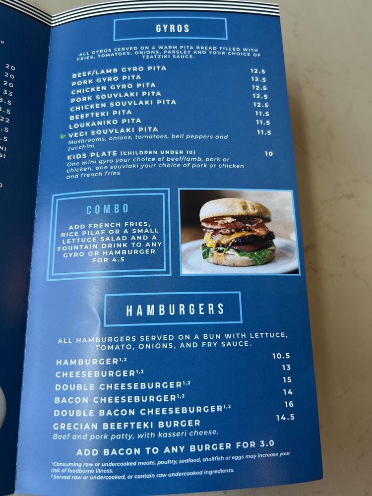1/3 lb. beef and pork patty seasoned to perfection, with Kasseri cheese served on a bun with lettuce, tomato, onions and Athenian sauce.