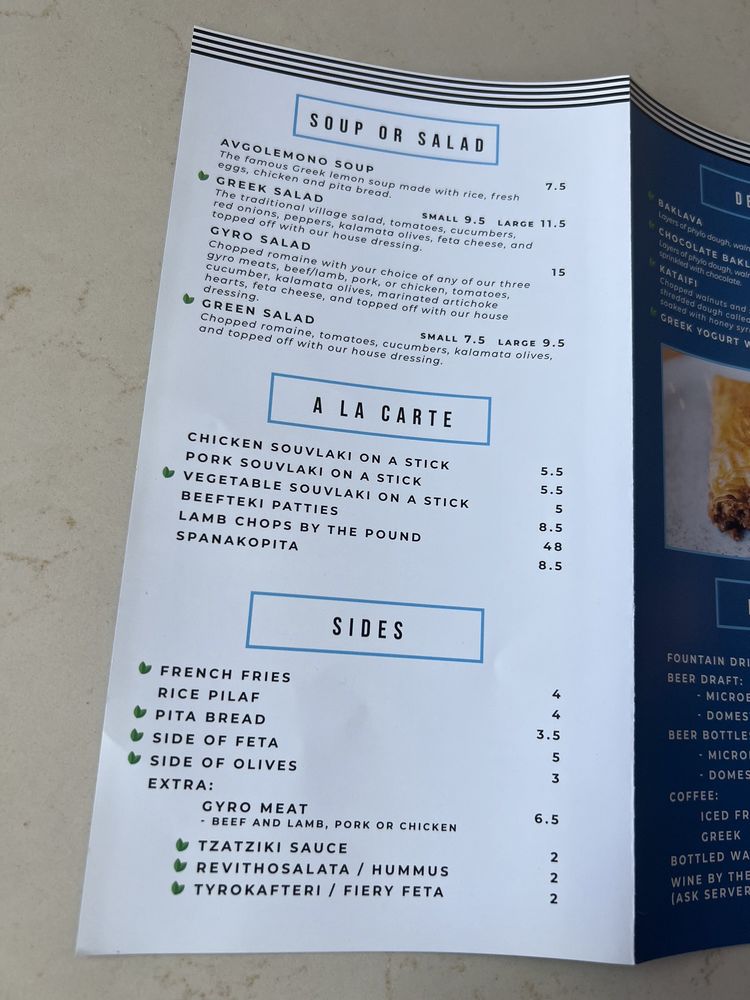 1 mini gyro, your choice of beef and lamb, pork or chicken, one souvlaki your choice of pork or chicken and french fries.